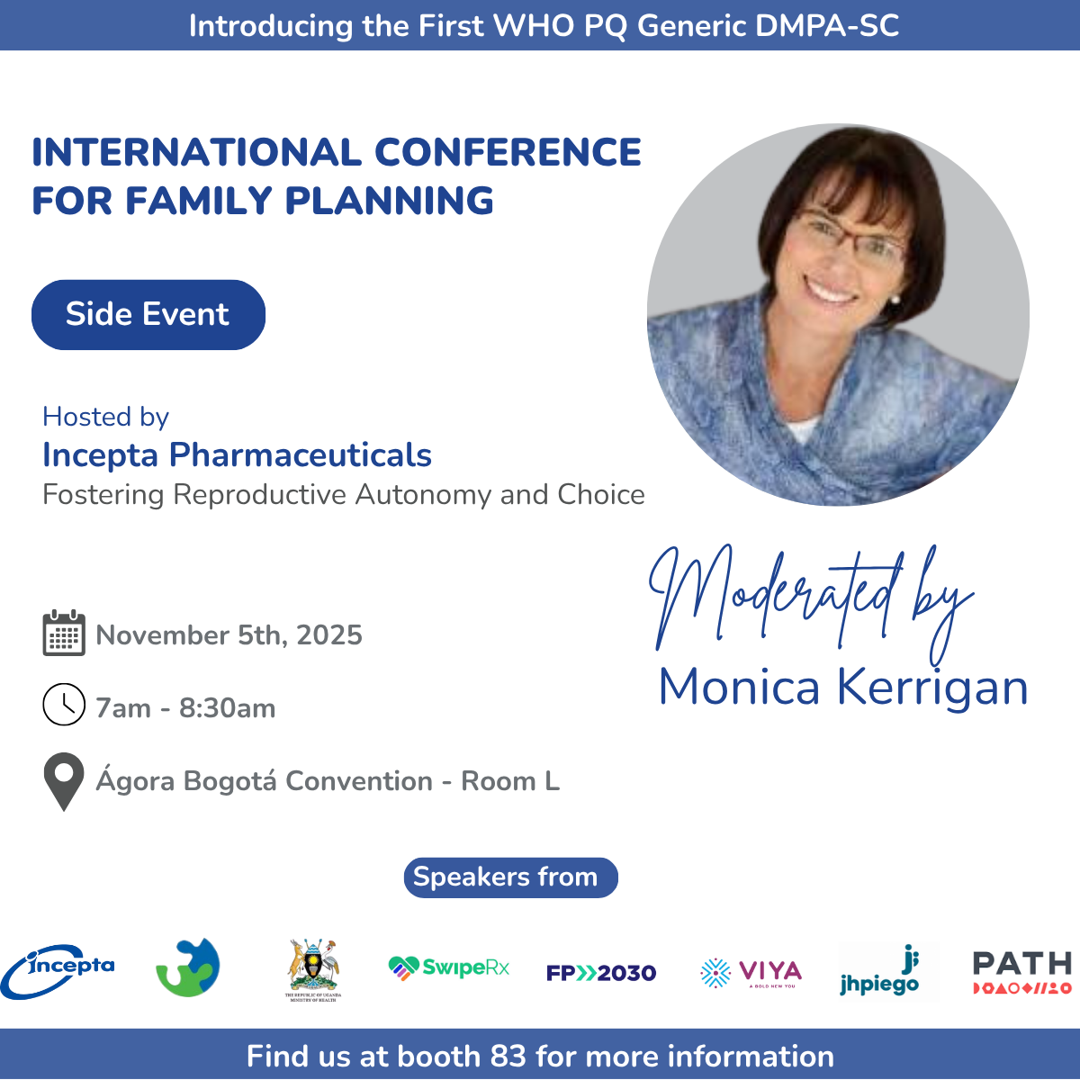 EnIncepta Pharmaceuticals Ltd. proudly stands as one of the leading generic pharmaceutical manufacturers in Bangladesh. We are honored to announce that our Generic DMPA-SC (subcutaneous depot medroxyprogesterone acetate) has received WHO Prequalification - a historic milestone as the first-ever generic product globally to achieve this prestigious accreditation.In the event we will discuss about role of DMPA-SC in achieving reproductive autonomy and perspectives of different stakeholders on opportunities to expand access to DMPA-SC in light of generic introduction.EsIncepta Pharmaceuticals Ltd. se enorgullece de ser uno de los principales fabricantes de medicamentos genéricos en Bangladés. Nos complace anunciar que nuestro DMPA-SC genérico (acetato de medroxiprogesterona para inyección subcutánea) ha recibido la precalificación de la OMS, un hito histórico al ser el primer producto genérico en el mundo en obtener esta prestigiosa acreditación.En este evento, analizaremos el papel del DMPA-SC en la promoción de la autonomía reproductiva y las perspectivas de diferentes actores sobre las oportunidades para ampliar el acceso al DMPA-SC tras la introducción de esta opción genérica.FrIncepta Pharmaceuticals Ltd. est fière de compter parmi les principaux fabricants de médicaments génériques au Bangladesh. Nous avons l'honneur d'annoncer que notre DMPA-SC générique (acétate de médroxyprogestérone sous forme injectable sous-cutanée) a obtenu la préqualification de l'OMS, une étape historique puisqu'il s'agit du tout premier produit générique au monde à recevoir cette prestigieuse accréditation.Lors de cet événement, nous discuterons du rôle du DMPA-SC dans la promotion de l'autonomie reproductive ainsi que des perspectives de différentes part ...